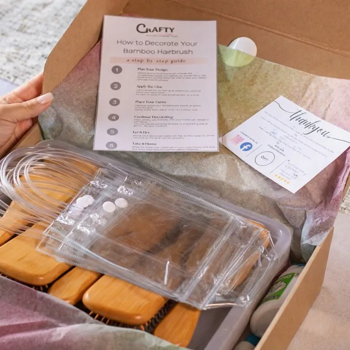 - 1x Wooden bamboo hairbrush per crafter (20 × 6.5 × 1.5 cm) - ready to be transformed into a beautiful personalised keepsake.